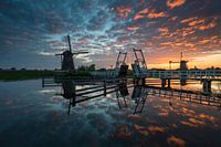 De nacht ontmoet de dag boven de molens van Kinderdijk. Na een prachtige zonsondergang op een windstille avond bij de UNESCO World Heritage site Kinderdijk nemen de blauwe tinten van de nacht langzaam de plaats in van het laatste gouden avondlicht.