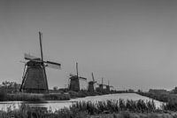 Het karaktristieke Kinderdijk in Nederland. Alle windmolens op een strakke lijn. Deze foto in zwart wit genomen, geeft het plaatje net iets ouderwets. Oud Hollands op z'n best