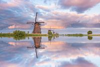 De molens van kinderdijk reflecteren in de rivier bij zonsondergang.