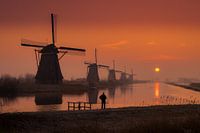 Zonsopkomst bij de bekende molens van Kinderdijk.
