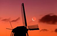 Silhouet van één van de negentien molens van Kinderdijk bij zonsopkomst. In de achtergrond de Nieuwe Maan.