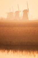 De molens van Kinderdijk gefotografeerd tijdens de zonsopgang op een mistige ochtend. In de voorgrond een sloot met rietkraag.
