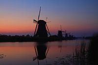 Windmolens in Kinderdijk kort voor zonsopgang, het enige tijdstip van de dag dat het er rustig is.