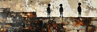 Kinderen Stad | Stadse Kinderen - Dit abstracte kunstwerk, geïnspireerd door urban artists zoals Banksy, toont drie gestileerde figuren van kinderen staand op een ruige, veelkleurige ondergrond die het gevoel van een vervallen stedelijke omgeving opwekt met een scala aan bruine en crème kleuren.
