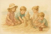 Kinderen die op het strand spelen en een zandkasteel bouwen. De kinderen zijn gekleed in strandkleding, met kleuren die overvloeien in het zandstrand. De kinderen gaan op in hun spel en genieten volop. Zonnestralen breken zacht door de sluier van wolken en zetten het tafereel in warm, diffuus licht. Op de achtergrond glinstert de zee,…