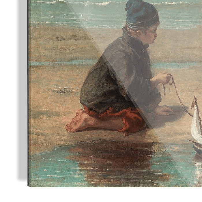 Een op zijn knieën zittend jongetje gekleed in jekkertje, roodbaaien broek en wollen muts laat een speelgoedbootje varen in een plas zeewater op het strand. Een meisje in een rode rok en met een wit kapje op het hoofd kijkt met over elkaar geslagen armen toe. In de achtergrond de zee met een bootje en daarboven een blauwe lucht.