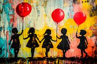 Dit kleurrijke kunstwerk straalt energie en vreugde uit, met de silhouetten van vijf kinderen die vrolijk rode ballonnen vasthouden. De achtergrond, geschilderd in een levendig kleurenpalet van geel, blauw en oranje, geeft het geheel een dynamische en speelse uitstraling. Perfect als decoratiestuk in een woonkamer of hal, brengt het een gevoel van nostalgie en jeugdigheid in elke ruimte. Een unieke mix van street art en moderne kunst, ideaal voor liefhebbers van eigentijdse stijlen en speelse ontwerpen.