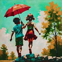 Dit schilderij is geïnspireerd op mijn eigen kindertijd! Het is een vreugdevolle viering van onschuld, een magisch moment in de tijd waar nieuwsgierigheid en kameraadschap elkaar ontmoeten. De stenen poort is een poort naar avontuur! Het markeert de drempel tussen het bekende en het onbekende, het comfort van thuis en de mysteries die daarachter wachten. De paraplu die ze delen is een prachtig symbool van eenheid en bescherming, een klein teken van samenwerking dat dit zonovergoten avontuur tot iets heel bijzonders maakt.