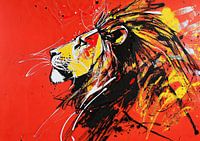 King of Colors Reigns - Dit levendige dieren schilderij toont een expressief portret van een leeuw met krachtige penseelstreken in rood, geel en zwart op een helderrode achtergrond, waarbij de majestueuze manen en intense blik van de leeuw centraal staan.