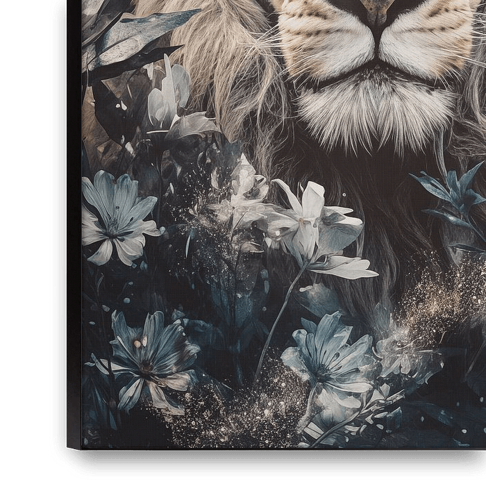 Dit indrukwekkende kunstwerk, getiteld 'King of the jungle', toont een subtiel portret van een majestueuze leeuw. Het beeld vangt de grootsheid en de kracht van de leeuw, omgeven door een botanische omgeving met weinig kleur.