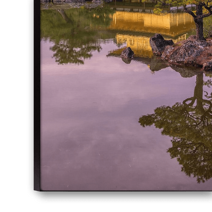 De compositie wordt prachtig geaccentueerd door een klein eilandje met een typische Japanse pijnboom op de voorgrond, wiens reflectie de symmetrie van het goud en het water breekt. Dit werk straalt rust, luxe en de tijdloze schoonheid van de Japanse architectuur en tuinkunst uit.