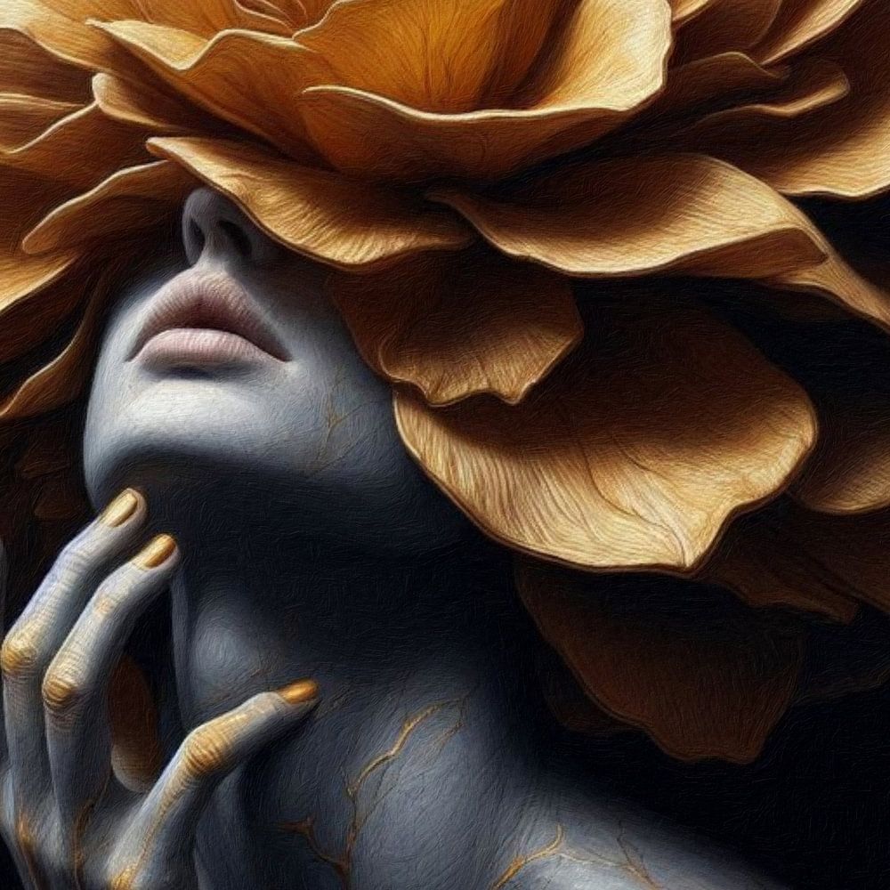Abstract, modern en surrealistisch portret van een jonge vrouw, half verscholen achter een grote gouden bloem. Een bijzonder kunstwerk in sfeervolle donkere tinten.