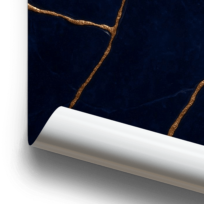 Deze indrukwekkende digitale poster toont een moderne, minimalistische interpretatie van Japanse kintsugi-kunst - een eeuwenoude techniek waarbij gebroken keramiek wordt gerepareerd met gouden laklijnen. Het centrale motief van dit werk combineert diep, elegant blauw met organische, gouden aderen die zich als een fijnmazig net over het…