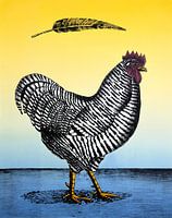 Een Litho, ofwel steenafdruk in verschillende kleuren van een Kip. Boven hem is een veer getekend. Een grafisch beeld met een mooi kleurverloop op de achtergrond.