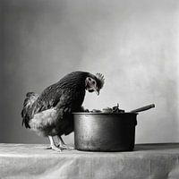 In een charmante mix van humor en nostalgie zien we een gevederde keukenhulp die nieuwsgierig in een grote pan tuurt. De monochrome esthetiek benadrukt de speelse sfeer en nodigt uit tot glimlachen. Ideaal voor een creatieve keuken waar culinaire hoogstandjes en goed humeur heersen!