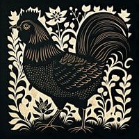 Een folkloristische linoleum print van een kip. Abstracte dieren kunst in een kleurenschema van zwart, beige en creme tinten.
