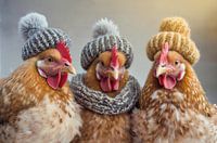 Drie kippen, op een winterse dag, met gebreide wollen mutsen en sjaals. De twee buitenste kippen hadden het niet zo koud dus deden alleen maar een muts op. Het beeld is met behulp van ai gegenereerd.