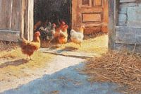 Een groep kippen stapt net de dag in, vanuit een donkere schuur naar het zonovergoten erf. Het stro glanst in het ochtendlicht, de schaduwen zijn nog lang, en je voelt bijna de frisse lucht en het zachte gekakel. De houten deuren staan open, alsof de boerderij net wakker wordt.
