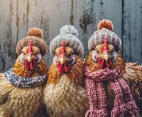 Drie kippen, op een winterse dag, met gebreide wollen mutsen en sjaals. De middelste kip hoefde geen sjaal, had het niet zo koud. Het beeld is met behulp van ai gegenereerd.