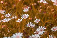 De foto toont een dicht veld van kleine witte bloemen met opvallende rode harten - een kleurrijk vervreemde weergave van kippenkruid (Stellaria holostea). De bloemen zijn verdeeld over geelgroene stengels en vormen samen een levendige, bijna tweedimensionale structuur. De natuurlijke verspreiding van de planten zorgt voor een organische…
