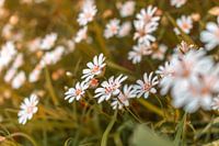 De afbeelding toont een close-up van een natuurlijk veld met talloze kleine witte bloemen met oranje hart - een artistiek gekleurde weergave van kippenkruid (Stellaria holostea). De bloemen worden omringd door groen gras en gebladerte, terwijl de achtergrond wordt vervaagd door een zacht bokeh-effect. Het warme licht, waarschijnlijk…