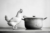 Een charmant stilleven dat het contrast vastlegt tussen een levendige kip en een glinsterende kookpot in monochrome elegantie. De nieuwsgierige houding van het gevogelte en de eenvoudige schoonheid van het servies voegen een vleugje landelijke flair toe aan elke keuken en een knipoog naar de culinaire wereld. Perfect voor aan de muur…