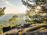 En opeens stap je uit het bos in het open veld en heb je zo'n geweldig uitzicht voor je. Een rotsterras met een prachtig 180-graden panorama, dat is het Kipphornaussicht. Boheems en Saksisch Zwitserland vloeien vanaf hier in elkaar over, het is één brede groene band met de Elbe als verbindende schakel. Dank u, prachtige Elbezandsteengebergte, voor deze unieke plek.