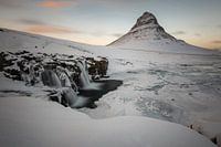 De markante berg Kirkjufell in west IJsland op het schiereiland Snaefellsnes is gehuld in een wit winterkleed. De ondergaande zon kleurt de lucht aangenaam tussen warm en pastel.