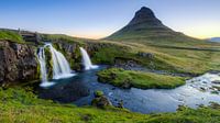 Een zeer vaak gefotografeerde scene in IJsland. De berg op de achtergrond heet Kirkjufell en de waterval op de voorgrond logischerwijs Kirkjufellsfoss. Helaas was er die ochtend geen wolkje aan de lucht, maar het leverde wel een mooie blauwe lucht.