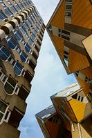 Tijdens het fotograferen van de Kubuswoningen in Rotterdam, zag ik ineens dit beeld ontstaan. Onder een bepaalde hoek zag ik een mooi symmetrisch driehoekje aan de bovenkant ontstaan en raakte het puntje van een kubuswoning het puntje van de flat. De gebouwen raken elkaar in het echt helemaal niet.