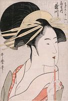 De courtisane Takigawa werkte voor het Ogiya, het "House of Fans" bordeel, een van de meest prestigieuze in de Yoshiwara. Hier rookt ze tabak, een modieuze trend in Edo uit de 18e eeuw.