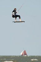 Hoge sprong van kitesurfer met schip in achtergrond (Markermeer, Nederland)
