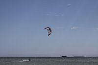 Een kitesurfer surft over de Middellandse Zee bij Corfu, Griekenland. Net geland van een sprong waar het water nog van omhoog spat.