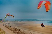 Langs de duinen van het uitgestrekte strand van Surtainville zweven de kitesurfers met hun fel kleurige parachutes boven het strand, met op de achtergrond de Atlantische oceaan.