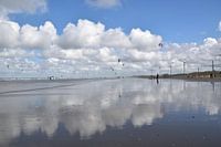 Kitesurfers zijn aan het surfen onder een heldere blauwe lucht bij Wijk aan Zee. De witte wolken steken prachtig af. Het waaide lekker hard, dus ze waren gelukkig. Doordat het eb werd reflecteerden de wolken prachtig op het terug trekkende water op het strand.