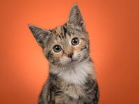 Portret van een lapjes kitten tegen een oranje achtergrond