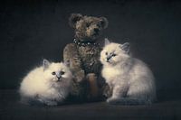 Twee ragdoll kittens en een steiff beer, in de sfeer van een oude foto.