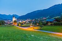 Kitzbühel in Tirol met de Liebfrauenkirche en de parochiekerk bij schemering.