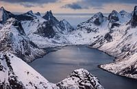 Kjerkfjorden tussen dramatische besneeuwde bergruggen in het licht van de zonsondergang, Lofoten
