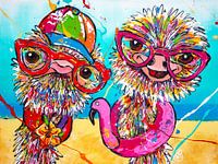 Kleurrijk tafereel met twee vrolijke struisvogels op het strand klaar om te zwemmen. Van de kunstenaar Renate Rolefes.