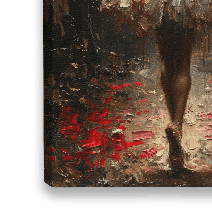 De rok van de ballerina is weelderig en textuurrijk, waardoor het lijkt alsof deze bestaat uit lagen van goud en crèmekleurige verf, die naar beneden druipt alsof het een verlenging van de beweging zelf is. De vloer weerspiegelt deze kleurenpracht met vegen en spatten van rode en gouden verf, die bijdragen aan de dynamische energie van het stuk.