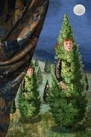 Een gordijn gaat open en onthult een nachtlandschap verlicht door de maan. Kerstbomen met menselijke gezichten staan hier, klaar om hun weg te vinden naar de huizen van de feestvierders.