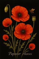 De helderrode bloembladen lijken op te lichten tegen het zwart, waardoor deze illustratie zowel kracht als kwetsbaarheid uitstraalt.