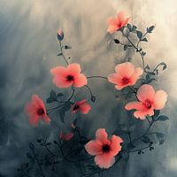 Een levendig compositie van rode klaprozen komt tot leven op het vierkant doek, hun delicate bloemblaadjes wuiven in de zachte bries. De warme, levendige tinten van de klaprozen steken prachtig af tegen de rustige achtergrond van beige en donkergrijs, die met subtiel aangebrachte texturen een gevoel van diepte en sereniteit creëren.