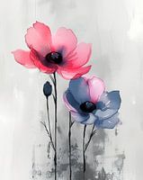 Een eenvoudig maar prachtig aquarel van enkele klaprozen, hun delicate bloemblaadjes wuiven in de zachte bries. De levendige tinten van de klaprozen steken prachtig af tegen de rustige achtergrond van beige en grijs, die met subtiel aangebrachte texturen een gevoel van diepte en sereniteit creëren.