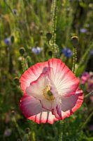 Close-up van een roze en witte klaproos bloesem. Hun tere bloemblaadjes gloeien in het zonlicht. Bijen zoemen rond. Een warme zomerdag loopt ten einde.