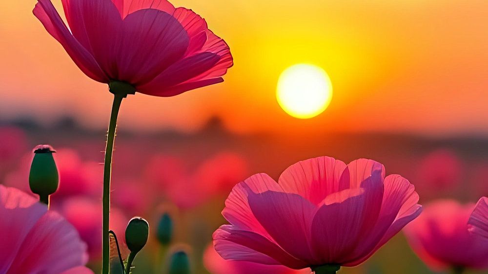 Op de achtergrond vestigt de zonsondergang langzaam de aandacht op zich wanneer de laatste stralen van de dag over het landschap glijden en de klaprozen in een gouden licht baden. Deze scène ademt een vredige en nostalgische sfeer uit en voert de kijker mee naar een moment van rust en bezinning. Het is een perfect voorbeeld van de schoonheid van de natuur en de magie van de overgang van dag naar nacht, gevangen in één enkel, fascinerend beeld.