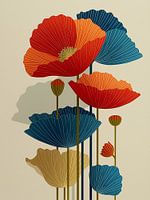 Een klaproos ontvouwt haar vurige rood, uitgesneden in strakke, geometrische lijnen als bij een blokdruk. Zwarte contouren omlijsten elke kroonbladkrul, terwijl het hart als een diep, donker stipmotief contrasteert. De stengel en bladeren zijn vereenvoudigd, ritmisch en hoekig, alsof elke lijn bewust hakt in papier. De compositie voelt traditioneel, ambachtelijk en toch krachtig modern, gevangen in de tijdloze esthetiek van blokdruk.