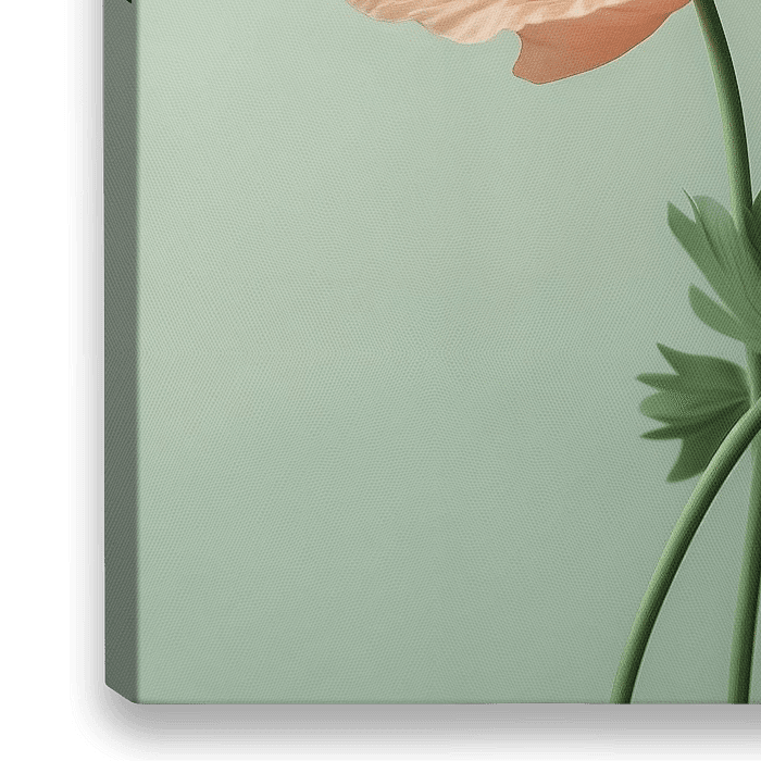 Een prachtige, realistische close-up van een klaproos die zachtjes openkomt, met delicate vouwingen in de verfijnde perzikkleurige bloembladen rondom een zwarte en gele kern. De steel en uitlopende bladeren brengen een gevoel van vitaliteit, groei en kalmte over, geaccentueerd door de neutrale achtergrond.