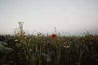 Fotoprint van een natuurlandschap vol wilde bloemen vlak voor zonsopkomst in Nederland.